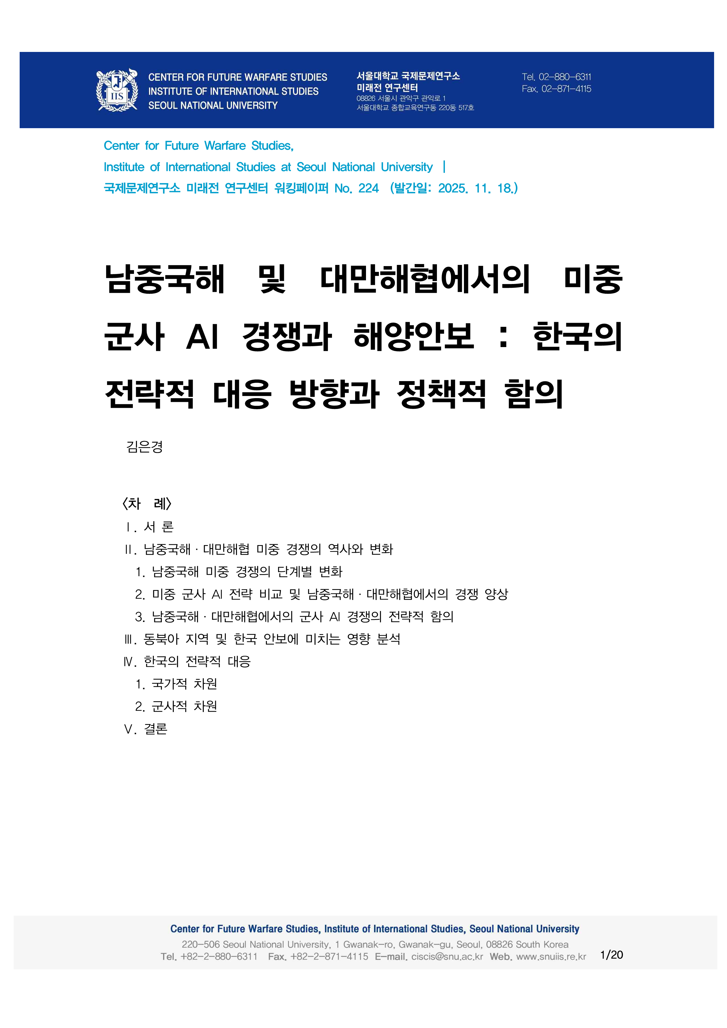 미래전 연구센터 워킹페이퍼 224 - 김은경 - 남중국해 및 대만해협에서의 미중 군사 AI 경쟁과 해양안보
