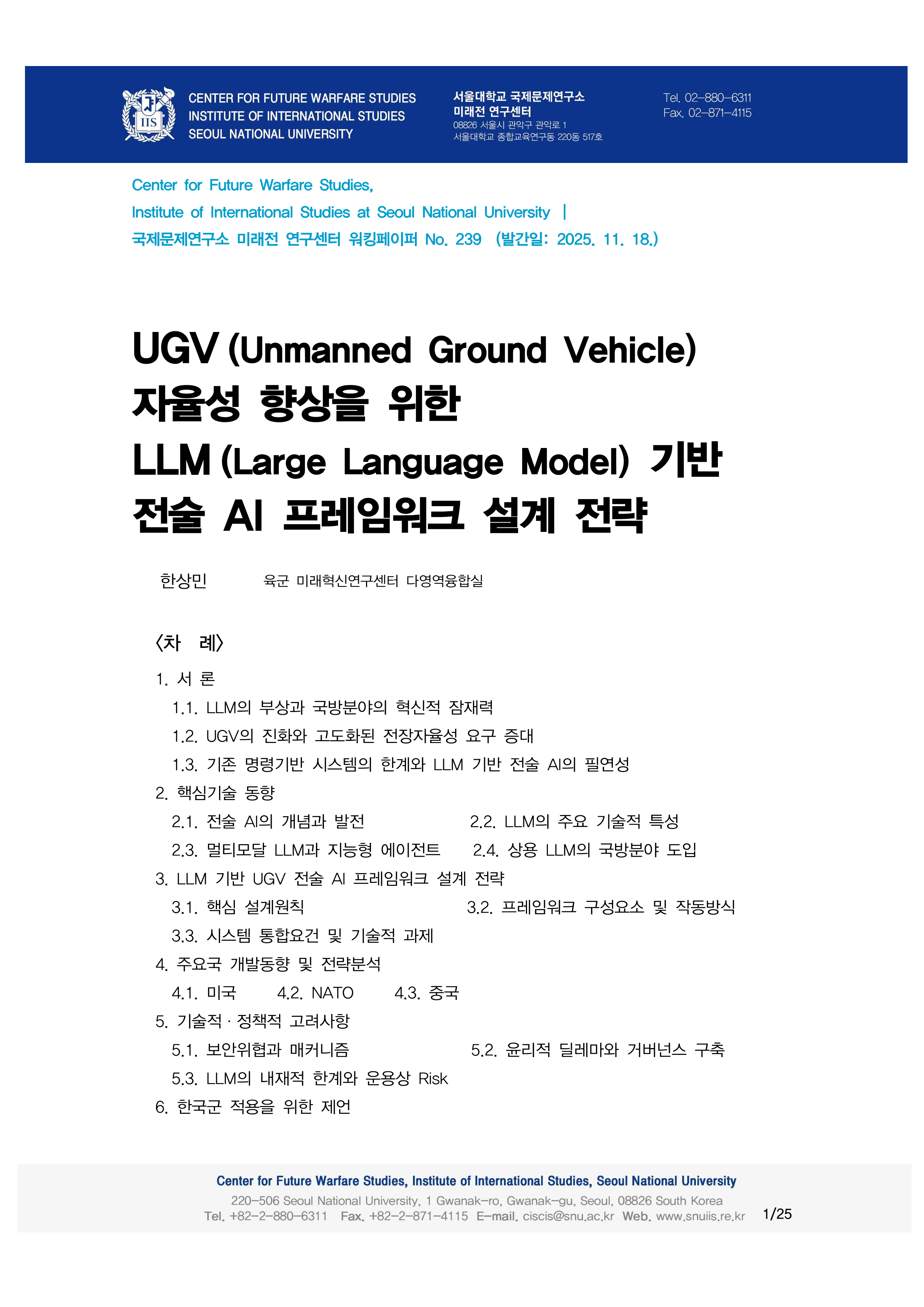 미래전 연구센터 워킹페이퍼 239 - 한상민 - UGV 자율성 향상을 위한 LLM 기반 전술 AI 프레임워크 설계 전략