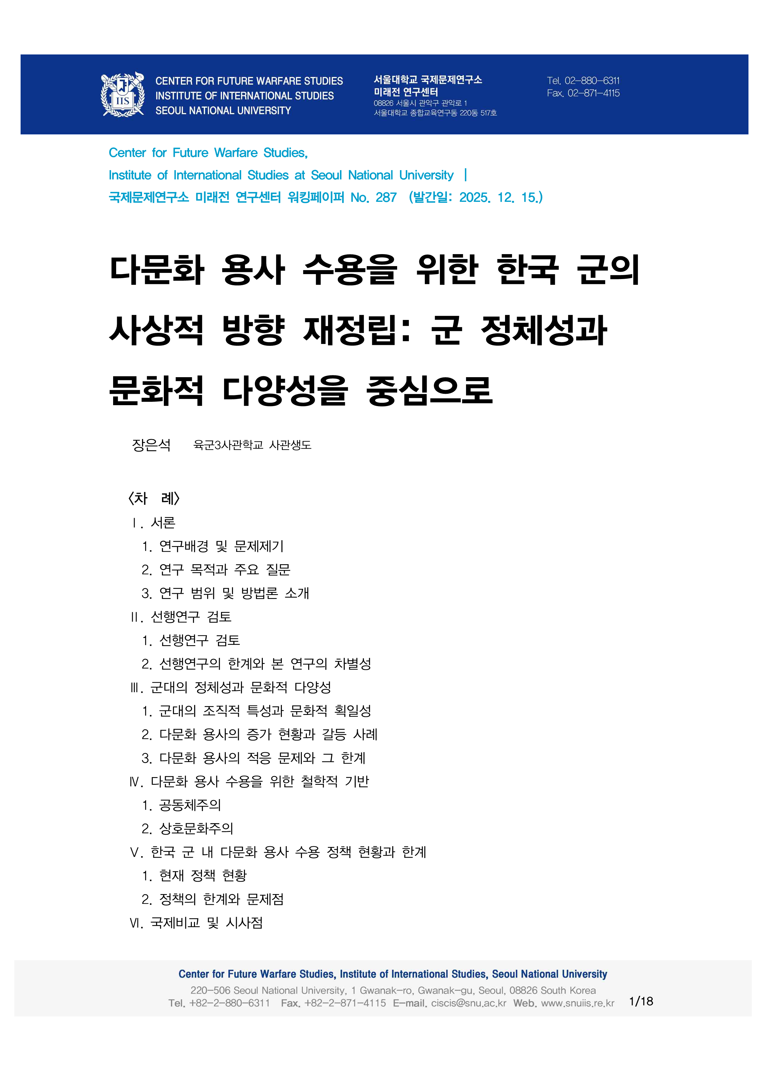 미래전 연구센터 워킹페이퍼 287 - 장은석 - 다문화 용사 수용을 위한 한국 군의 사상적 방향 재정립