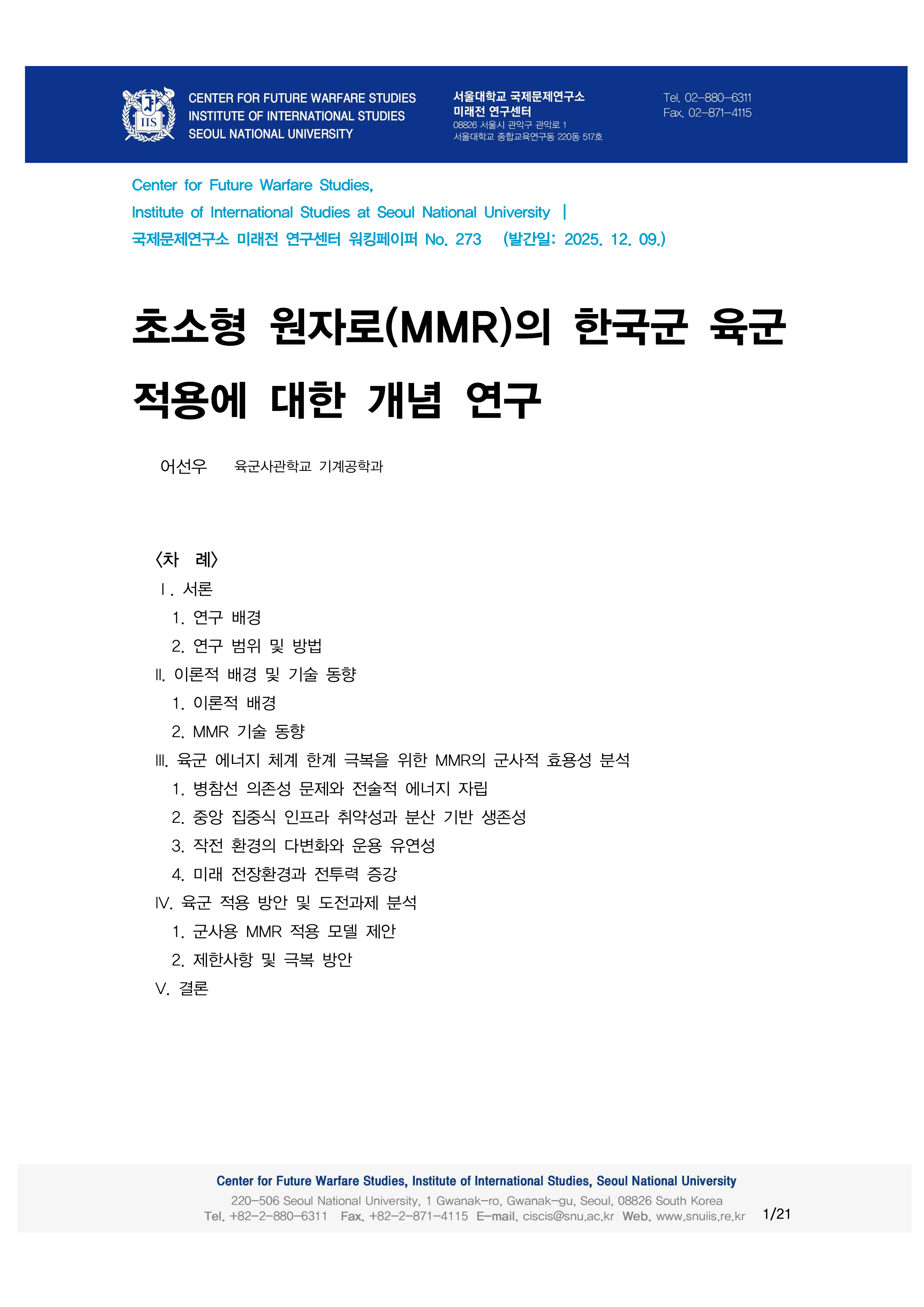 미래전 연구센터 워킹페이퍼 273 - 어선우 - 초소형 원자로의 한국군 육군 적용에 대한 개념 연구