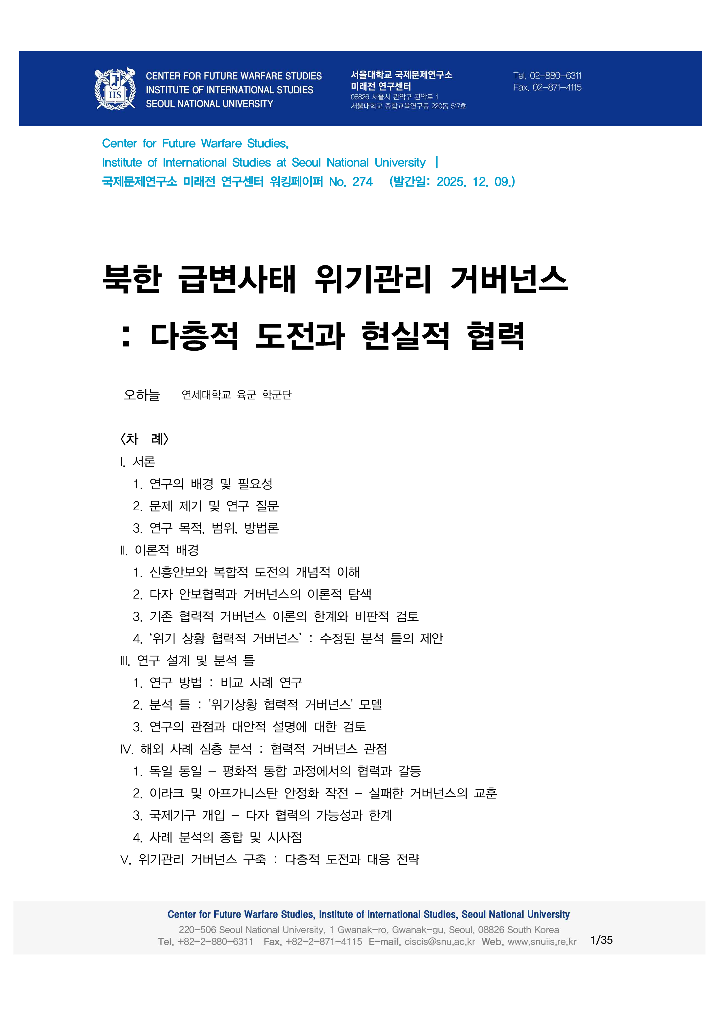 미래전 연구센터 워킹페이퍼 274 - 오하늘 - 북한 급변사태 위기관리 거버넌스