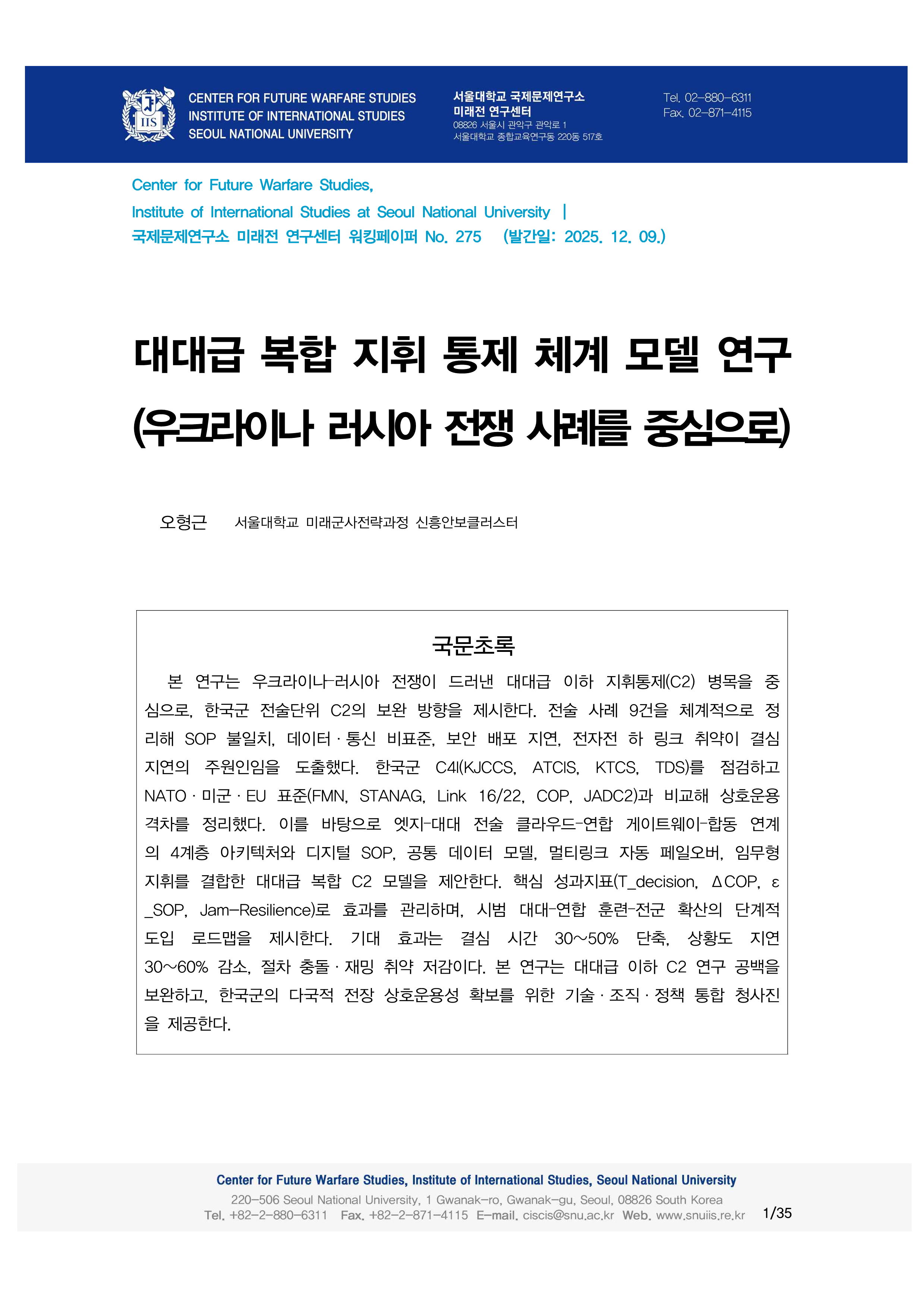 미래전 연구센터 워킹페이퍼 275 - 오형근 - 대대급 복합 지휘 통제 체계 모델 연구